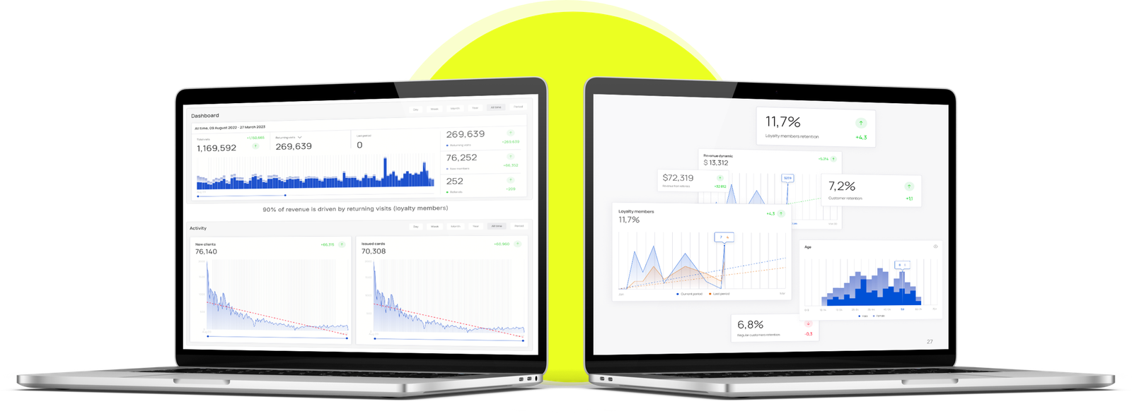Automatic PUSH notifications with the transaction information come instantly at the time of sale. The message informs the client about their current toyalty and reward status.